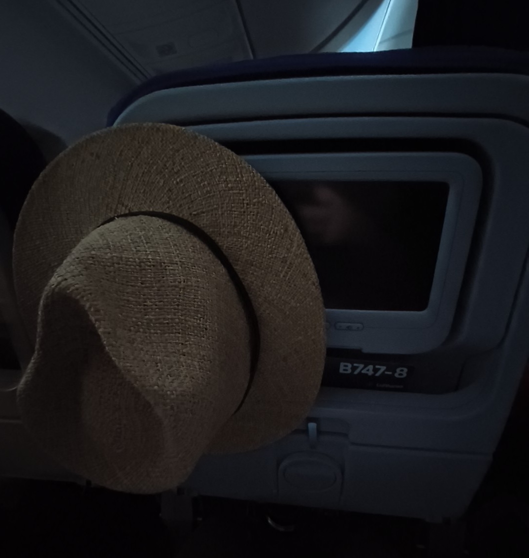 Odhod iz Frankfurta ni bil težaven, smo pa bili razporejeni na zgornje in spodnje nadstropje letala. Udobno smo se namestili, klobuke posadili v naročje ali nataknili na obešalnik in se kratkočasili s spanjem, opravljanjem službenih dolžnosti ali pa gledanjem filmov. 10 urni let je minil brez težav, trajal je pa le 4 ure (če bi gledali le uro prihoda in odhoda).