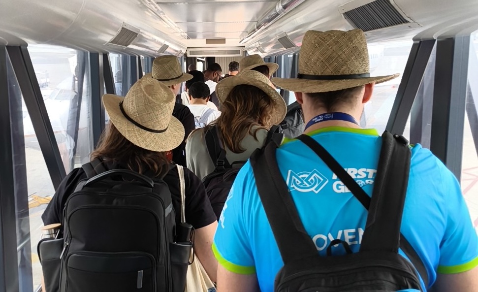 sli na bus, na letaliscu prepakirali stvari (vrece ostale), pol dolga vrsta, so nas jebal s folijo. Prišli na gate, kupili kavo/čas, zamenjali gate (še enkrat security). S pripravljenimi in stehtanimi kovčki smo se postavili v dolgo vrsto. Na sredini le te je do nas prišel gospod in rekel, da lahko pridemo z njem na drugo stran hale, kjer je kolona prazna. Priložnost smo zagrabili in se napotili za njem. Na poti nam je povedal, da moramo škatlo od robota zaviti v folijo. Ekipa je šla namprej, mentor pa pristopil gospodu s strojem za folijo. Med nalaganjem je zasledil račun na stroju in vprašal za ceno. Stric je pokazal na napis "17$", kar je mentor vljudno zavrnil. Nato smo preverili, če lahko škatlo sami zavijemo in so rekli, da lahko. Tako da smo dodajali srebrni lepilni trak po robovih, ogljiščih in čez glave vijakov. Vmes smo preverjali in vsakič je bilo "še malo". Nato smo malo po ovinkih prišli mimo zaposlenih, češ da je "vaš sodelavec rekel da je ok". Na recepciji za check-in je mentor dobil od gospoda listek, na katerem je podpisal in odkljukal, da oddaja prtljago brez folije. S tem smo to komplikacijo rešili. Zdaj pa varnostni pregled in na letalo. Čakali smo nekaj časa na prvotnih vratih in hodili po trgovinah. Vmes so vrata zamenjali, tako da smo počasi prešli na drug konec hodnika, vendar nas je tam pričakala dolga kolona in še en varnostni pregled (aha, zato nam rekli da ne moremo pijač iz trgovine nesti na letalo).